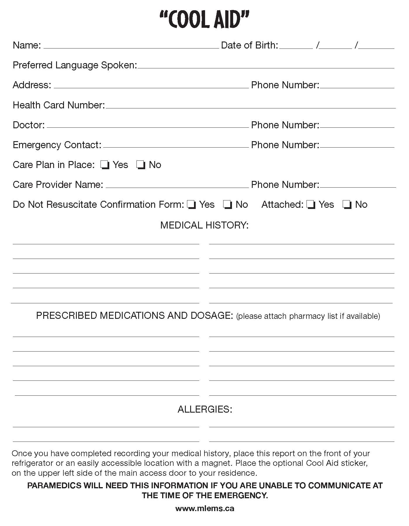 Cool Aid Medical information Form is helpful in the event that you fall victim to a medical emergency that leaves you unresponsive or unable to speak. A Cool Aid Form will inform paramedics or any other first responder of your personal and medical information that may be needed to save your life. By placing a current and complete form on your fridge door, or keeping a copy with medications paramedics will have access to your key medical information in one place. Having a Cool Aid Form is highly encouraged regardless of age, gender, ethnicity, or medical frailty.