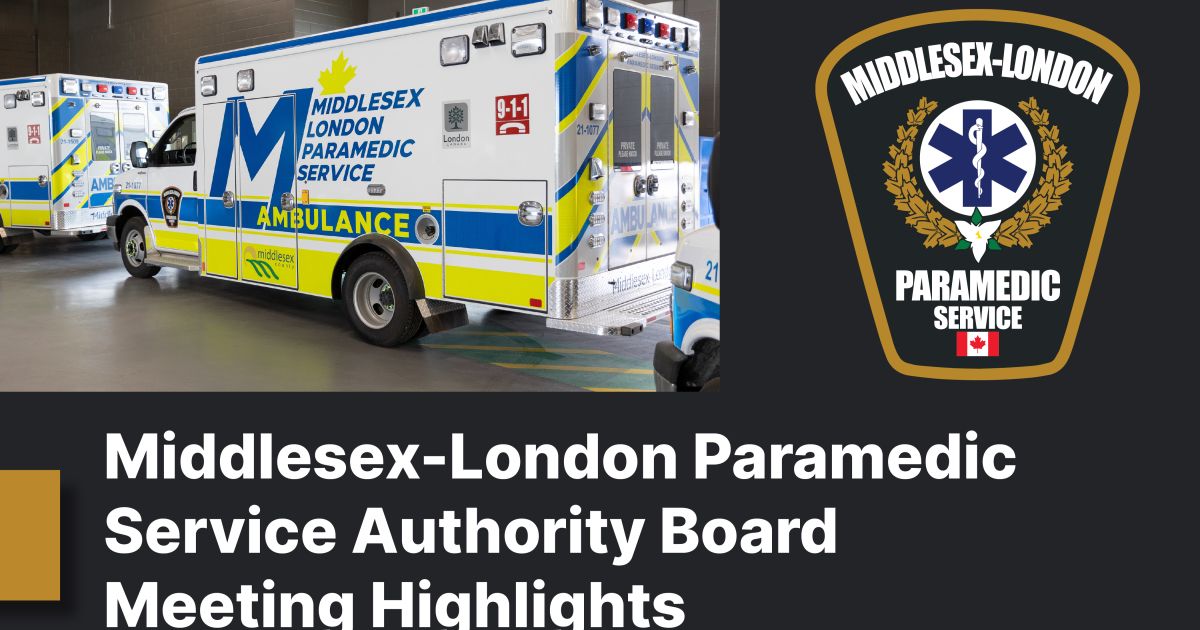 Middlesex-London Paramedic Service Authority Board Meeting Highlights is an informal summary of selected actions taken by the MLPS Authority Board at its meetings. MLPS Board Highlights are not an official record of Board proceedings. To view official meeting agendas and minutes, please visit Agendas and Minutes.